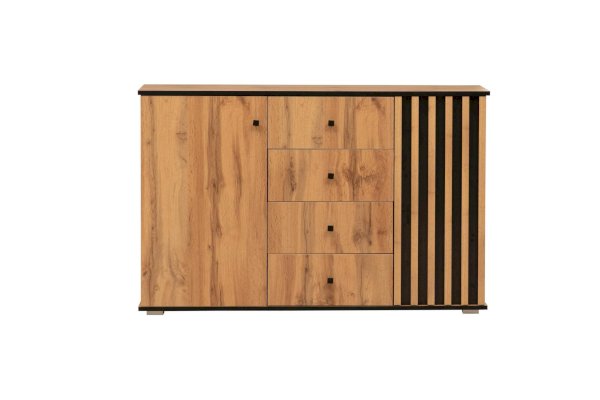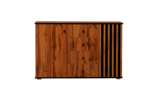 По краям – справа и слева – за распашными дверцами находятся полки, а в середине – четыре выдвижных ящика. Однако в середине – это не значит, что в центре. Принцип асимметрии здесь ярко выражен. Левая часть комода самая широкая, правая – гораздо уже. А пространство между ними отдано под выдвижные ящики. Таким образом, самая вместительная часть комода находится слева, за однотонной распашной дверцей цвета дуба Вотан. Внутри – два отделения – больших и вместительных, сюда поместятся объемные вещи. Каждая полка из ЛДСП выдерживает до 5 кг. В правой стороне места чуть поменьше – за счет ширины полок, но вполне достаточно, чтобы разместить, например, коробки с обувью или сложить вещи или постельное белье. Выдвижные ящики предназначены для хранения менее габаритных вещей. В зависимости от тематики помещения в них можно разложить бумаги, документы, нижнее белье, полотенца. На верх комода можно поставить телевизор, а если повесить над ним зеркало и на столешнице расставить духи и косметику, он превратится в туалетный столик!