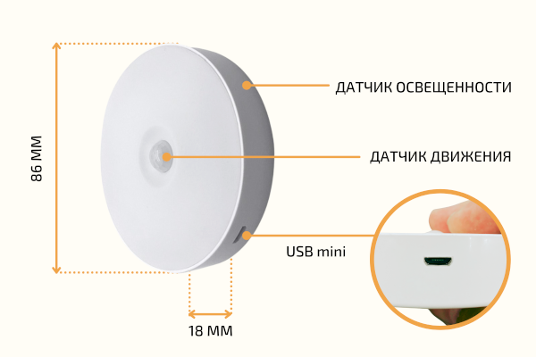• Оснащен ИК-датчиком света, что позволяет автоматически срабатывать ночнику в темноте и не включатся при свете днем