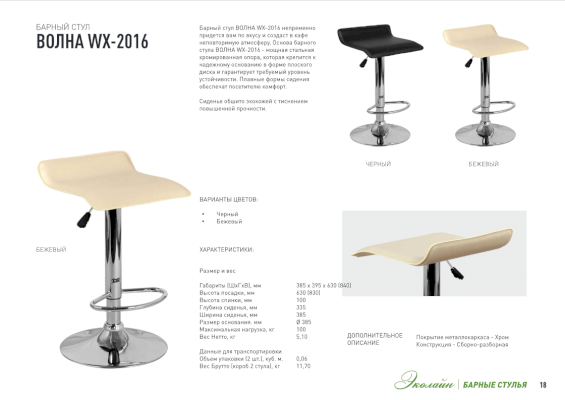Барный стул ВОЛНА WX-2016 непременно придется вам по вкусу и создаст в кафе неповторимую атмосферу. Основа барного стула ВОЛНА WX-2016 - мощная стальная хромированная опора, которая крепится к надежному основанию в форме плоского диска и гарантирует требуемый уровень устойчивости. Плавные формы сидения обеспечат посетителю комфорт.