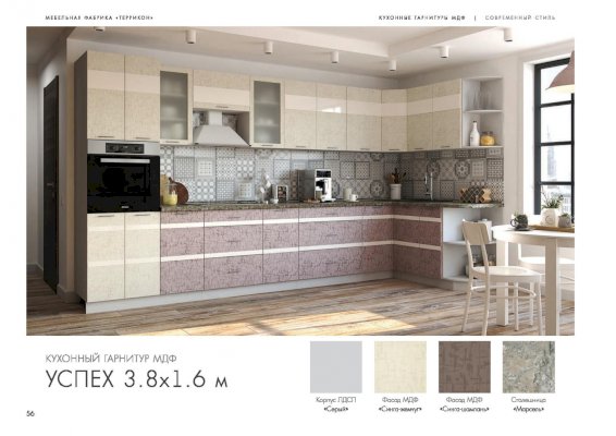 Кухня Успех изговаливается также в цветах серый/гобелен платина; серый/гобелен шампань; серый/синга жемчуг; серый/синга пурпур. Модули в этих цветовых решениях вы сможете найти в нашем интернет-магазине.