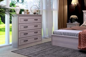 В комоде вам доступны четыре выдвижных ящика на шариковых направляющих с механизмом полного выдвижения. Такая конструкция позволяет структурировать и упорядочить хранение. А отдельным бонусом применения такого предмета в интерьере является возможность украсить пространство, расположив на столешнице вазу, статуэтку или красивый светильник.