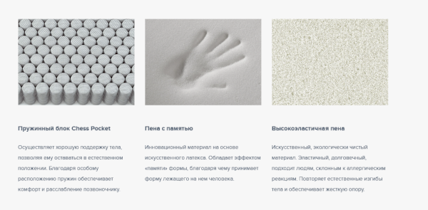 Состав: Турецкий трикотаж, стеганный на высокоэластичной пене и синтепоне Пена с эффектом памяти Белый хлопковый войлок Независимый пружинный блок ChessPocket Белый хлопковый войлок Высокоэластичная пена Усиление по периметру матраса