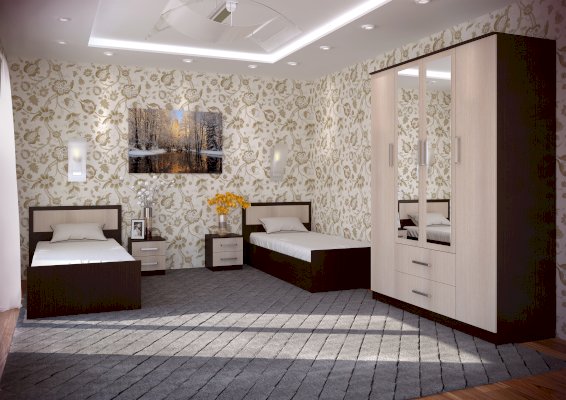Вместительный четырёхстворчатый шкаф Фиеста справится с большим гардеробом и другими вещами. Модель выполнена из качественной ЛДСП. Корпус сделан в темном цвете венге, а фасады – в светлом лоредо. Комплектация представляет собой центральную зону с двумя нижними выкатными ящиками и отделения со штангой для одежды на плечиках. Справа и слева расположились многочисленные полки для вещей. В створки центральных дверок вмонтированы зеркала.