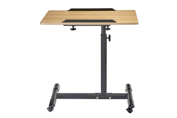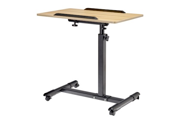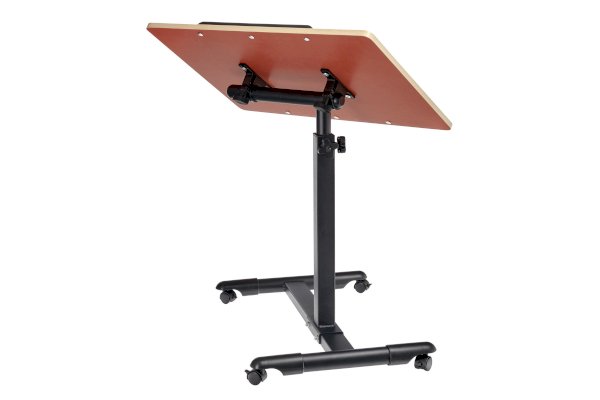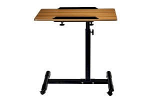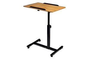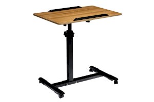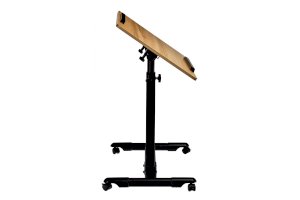 Столик оборудован поворотной столешницей из МДФ и металлическим основанием. Угол поворота столешницы составляет 180°, вплоть до вертикального положения. Высота подъема регулируется в диапазоне от 65 до 97 см. На столешнице имеются ограничители для ноутбука, планшета, предотвращающие падение гаджета.