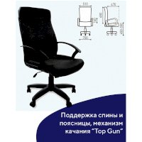 Надежный механизм качания "Top Gun" гарантирует хорошую поддержку спины и поясницы за счет возможности свободного качания с фиксацией в одном рабочем положении и регулировку угла наклона под вес сидящего.