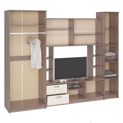 Комментарий: Долго искал гостиную под большой телевизор.Подошла только эта,с небольшой переделкой.Убрал боковые полки и поднял среднюю полку.В результате добился чего хотел.Очень доволен.