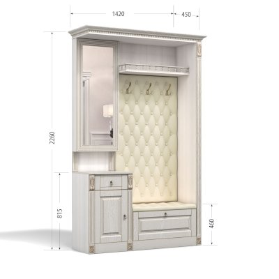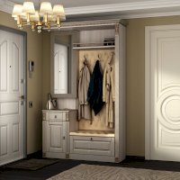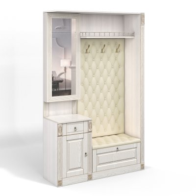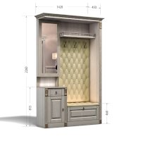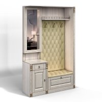 Прихожая выполнена в классическом стиле с декоративными элементами. Фасады и декоративные элементы патинированы, патина наносится вручную, по классической итальянской технологии и защищена матовым лаком. Мягкие элементы (вешалка и сиденье) выполнены из экокожи, декорированы каретной стяжкой.