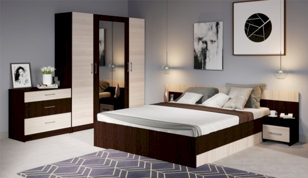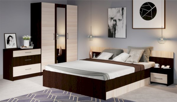 Спальня Алена выполнена в стиле минимализм - естественные цвета, текстура дерева, простота и функциональность. В комплекте Алена оптимальный набор функциональных модулей, который необходим для обустройства спальни: вместительный шкаф с полками и штангой, комод с ящиками, кровать с крепким и надежным основанием из ламинированной плиты и прикроватные тумбы. Кровать с двух сторон идеально дополняют идентичные по стилю прикроватные тумбы с высокой стенкой на одном уровне с изголовьем кровати - это создает визуальную целостность, добавляет ощущение защищенности.