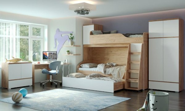 Шкаф 4С1Я с ящиком на направляющих полного выдвижения, с поперечной металлической штангой для верхней одежды, с полками. Применение интегрированной ручки на фасадах делает модель стильной и безопасной – дверцы открываются за профилированные выступы. Фасады обработаны кромкой 1 мм. Черная регулируемая ножка-опора.