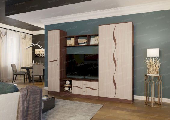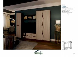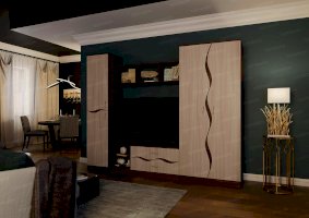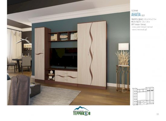 Гостиная «Анапа» — это неброская, изящная модель. Главным ее украшением служит отделка натуральных цветов с достоверной имитацией фактуры благородных сортов древесины. Плавно изогнутые линии на фасаде создают ощущение мягкости и возвышенности. В комплект входят два вместительных шкафа, открытые полочки, тумба. В центральной части гарнитура отведено место под телевизор.