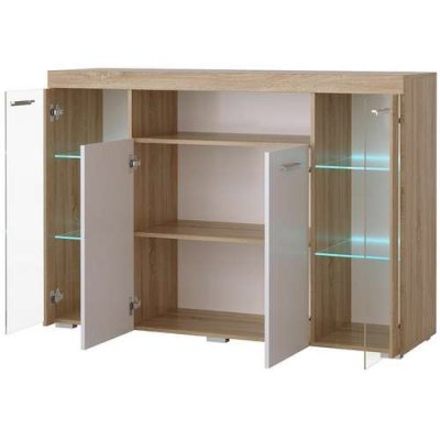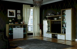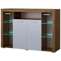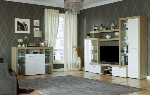 Корпус комода обрамлён профилем MDF оригинальной формы. Опционально возможна установка светодиодной подсветки для стеклополок.