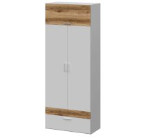 Шкаф двухдверный. Сверху антресоль, открывается вверх на газлифте. Внутри полка, выдвижная штанга, на боковинах крючки для одежды. Внизу ящик, направляющие НПВ шариковые.