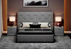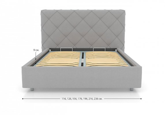 Изысканная и элегантная интерьерная кровать. В комплект входит кроватное основание. При необходимости кровать может снабжаться подъемным механизмом с бельевым ящиком.