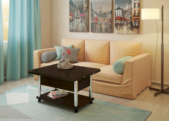 - Функциональность. Купив стол-трансформер потребитель получает сразу два изделия: небольшой журнальный столик и полноценный обеденный стол на 6–8 человек.