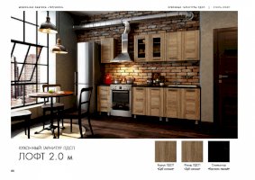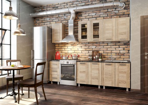 Для тех, кому по душе чердачная романтика, представлен кухонный гарнитур «Лофт». Искусная стилизация под натуральную древесину отлично сочетается с большими окнами, отделкой из кирпича и камня, не крашенными металлическими трубами. Несмотря на внешнюю простоватость, комплект не перегружает интерьер, напротив, он делает обстановку раскрепощенной и ненавязчивой.