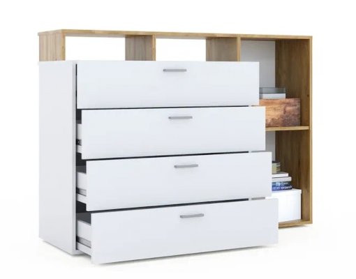 Наполнение: 4 выдвижных ящика + открытые полки + шкаф с распашной дверцей (1 полка внутри)