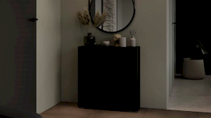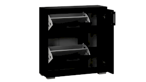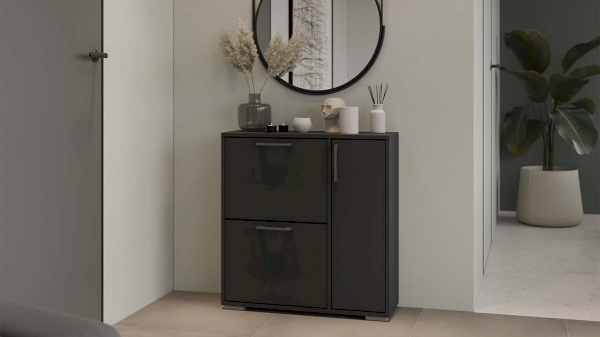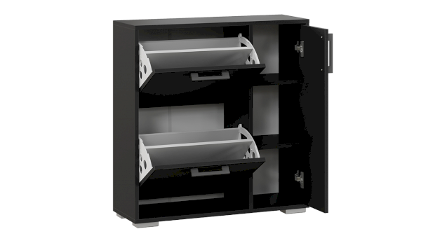 Тумба для обуви имеет 2 откидных ниши для бережного хранения обуви и место за распашным фасадом. Данное пространство можно использовать для хранения обувных аксессуаров и различных мелочей, что без сомнений является преимуществом новинки.