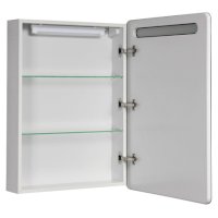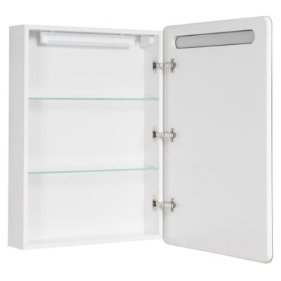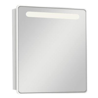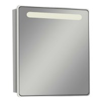 Зеркало представляет собой удобный шкафчик, оборудованный подсветкой, а его фасады оснащены влагостойким покрытием.