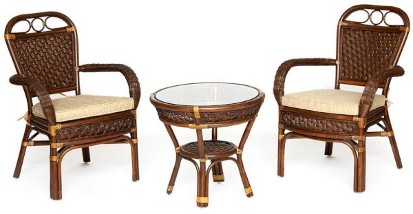 Комплект: стол кофейный со стеклом + 2 кресла + подушки