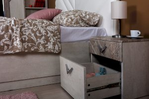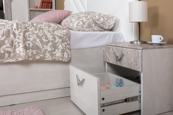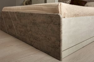 Мягкое изголовье и изножье кровати выполнено из экокожи, что гарантирует комфорт при эксплуатации и легкость в уходе. Декоративная прострочка повторяет общий мотив всей коллекции.