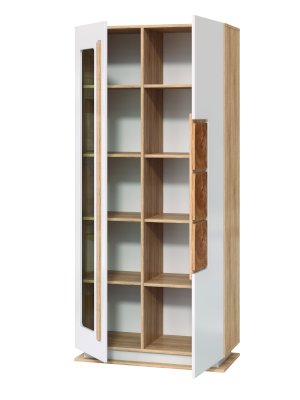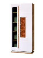 Шкаф с комбинированными распашными фасадами на петлях без доводчиков. Слева-фасад со стеклянной вставкой, справа-глухой фасад с декоративными элементами прямоугольной формы, имитирующими спил дерева. Эффект древесного рисунка достигается благодаря техники УФ-печати.