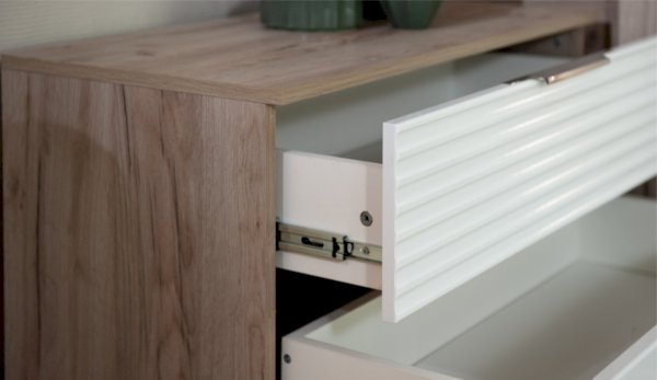 Цвет: Дуб крафт серый/Белый глянец High Gloss с фрезерованным рисунком "волна"