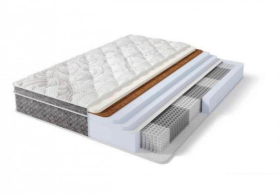 Состав: Турецкий трикотаж, стеганный на высокоэластичной пене и синтепоне Пена с эффектом памяти Кокосовая койра Высокоэластичная пена Белый хлопковый войлок Независимый пружинный блок MultiPocket 7 зон Усиление по периметру матраса