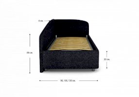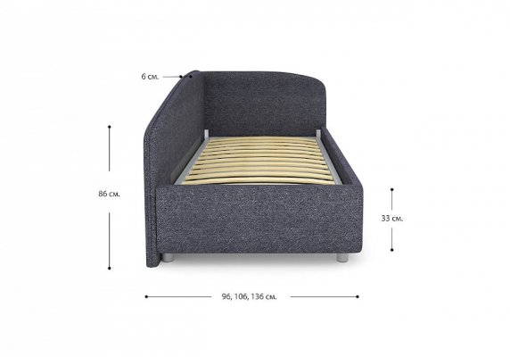 Односпальная кровать для ребенка или подростка. Модель изготовлена из ДСП. В комплект кровати входит кроватное основание без опор. Каркас основания выполнен из металла, ламели - из берёзы.