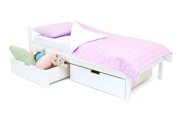 Для удобства хранения игрушек или постельных принадлежностей, вы можете приобрести еще вместительные ящики, которые устанавливаются под основание кровати. Многообразие цветов фасадов ящика позволяет скомплектовать разные варианты.