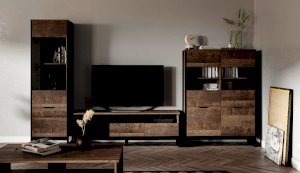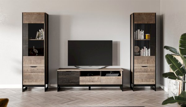 Функциональная тумба для TV и аудио аппаратуры оснащена двумя ящиками на телескопических направляющих, закрытыми и открытыми полками для хранения сопутствующих аксессуаров. Отсутствие лицевой фурнитуры подчеркивает минимализм и геометрию модуля. Особенность дизайна – это сочетание реалистичных по цвету и тактильности трендовых декоров, которые соответствуют последним городским тенденциям. «Дуб Гранж» привлекает имитацией вручную обработанного дерева и выразительной зернистой текстурой, характерной формой досок. Стильный серый цвет «Железного камня» с металлическими разводами и новая текстура состаренной штукатурки в сочетании с гладкостью металла вносят индустриальныи? колорит. Оригинальные ножки-опоры из МДФ контрастного цвета придают изюминку интерьеру.