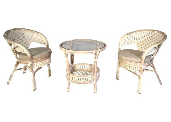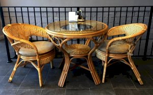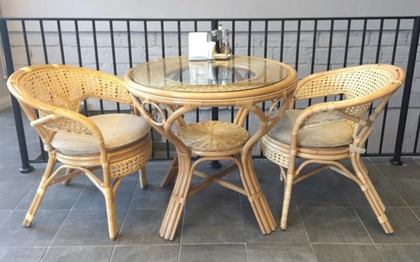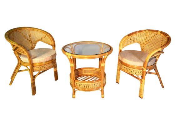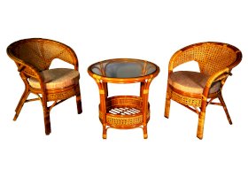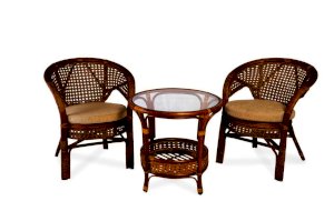 Комплект мебели Пеланги 02/15 включает в себя: 2 кресла и столик с красивым плетением снизу и полочкой, съемные подушки из материала улучшенного качества.