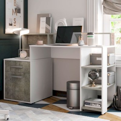 Компьютерный стол Лайф – это не просто стол, это полноценно оборудованное рабочее место. Модель состоит из вместительной столешницы, открытых и закрытых полок, а также небольшого выдвижного ящика для мелких вещей. Изделие выполнено из ЛДСП в сочетании цветов белый и метрополитан грей, оно прекрасно впишется в светлый современный интерьер.