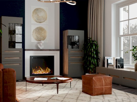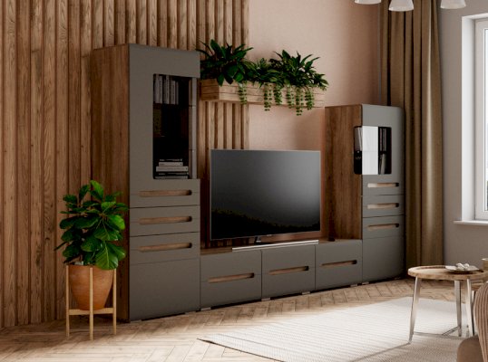 Модульная гостиная «Наоми» - это свежий одухотворенный интерьер, наполненный светом, комфортом и функциональностью. Уникальная геометрия фрезерованных фасадов создает атмосферу ультра-современности и минимализма. Контрастность сочетания матового декора корпуса элитного дерева «Дуб Каньон» с безмятежно-белыми глянцевыми створками относит нас к спокойствию, экологичности и безмятежности. Оригинальное конструктивное решение коллекции – ручки фасадов, выполненные путем сложной фрезеровки и подчеркнутые углубленным декором дубового спила.