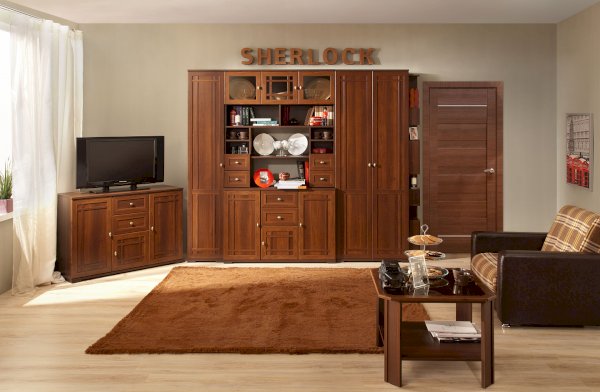 Необычная гостиная «Sherlock» (Шерлок), выполненная в брутальном английском стиле, создаст строгое и правильное настроение времен конца 19 века. Изюминка данной коллекции - это необычные для мебели рамочные фасады, дополненные тонкими накладками, что придает гостиной дополнительный шарм. Классика актуальна во все времена и не подвержена веяниям изменчивой моды. Поэтому, классическая коллекция корпусной мебели для гостиной SHERLOCK всегда будет выглядеть стильно в Вашей гостиной.