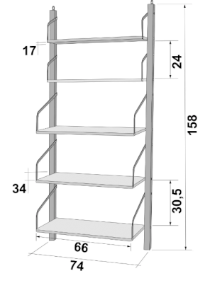 Стеллаж изготавливается из массива сосны, покрытого эмалью/лаком на водной основе, полки из ЛДСП. Полкодержатели металлические, покрыты порошковой краской.