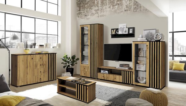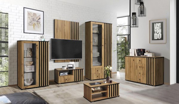 Шкаф визуально разделен на две части. В самом шкафу все просто – левое пространство за стеклом, правое – закрытое. Внутри – по три полки из ЛДСП. Каждая выдерживает вес до 5 кг. Стеклянная дверца обрамлена рамкой в цвет дерева, закрытая – с визитной карточкой коллекции –   с реечным фасадом. Они разной ширины, так как левая часть, по традиции коллекции, шире, а правая – уже. За стеклом отлично смотрится посуда и сувениры, за закрытой дверцей – книги.