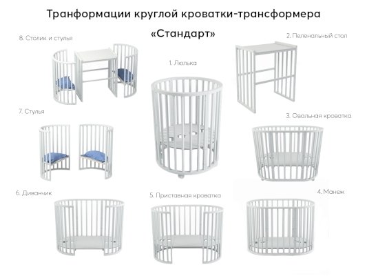 Что идёт в комплекте? С покупкой кроватки Вы получаете все 8 трансформаций + колёсики с блокираторами движения. Отдельно покупаются: