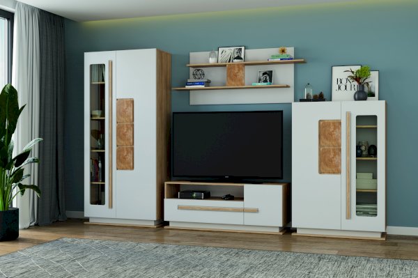 Шкаф с комбинированными распашными фасадами на петлях без доводчиков. Справа-фасад со стеклянной вставкой, слева-глухой фасад с декоративными элементами прямоугольной формы, имитирующими спил дерева. Эффект древесного рисунка достигается благодаря техники УФ-печати.
