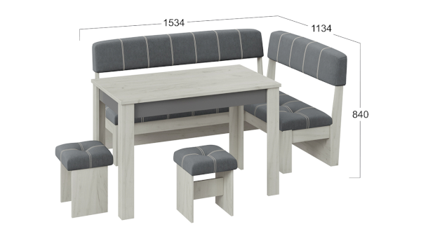 Каркас кухонного уголка изготовлен из ЛДСП 16 мм. Этот материал отличается прочностью, надёжностью и способностью прослужить много лет. В обработке торцов используется кромка ПВХ. Для мягкости применяется практичный наполнитель ППУ, который имеет высокий уровень влагообмена и воздухопроницаемости.