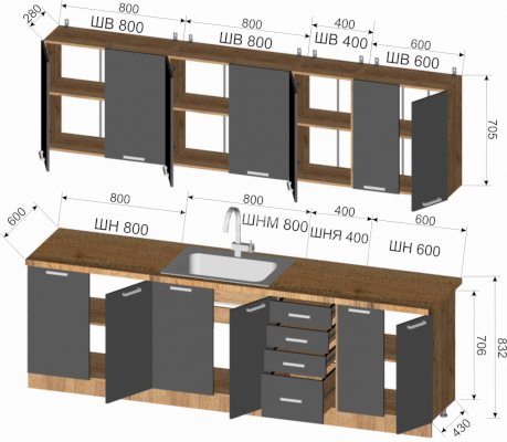 Шкаф нижний (с ящиками): 400х830х450 мм
