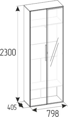 Двухдверный распашной шкаф с одним глухим фасадом и одним зеркальным фасадом в раме. Глухой фасад с серой ручкой из массива, фасад Зеркало Контур открывается за ручку-петлю из высокопрочной микрофибры. Регулируемые опоры компенсируют незначительные неровности пола.