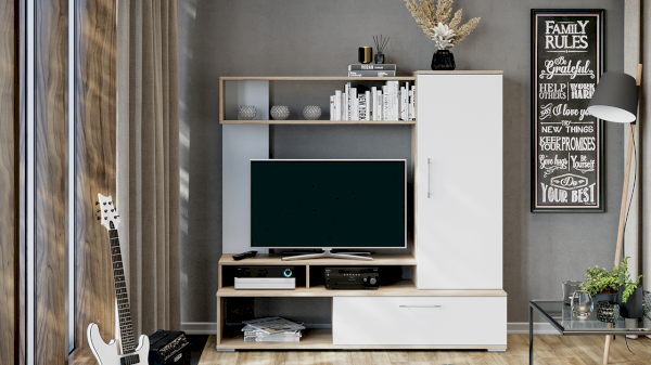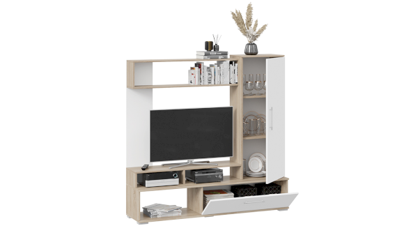 Кроме внешнего вида «Сиена» представляет собой единый набор, имеющий в составе всё необходимое для установки и использования в гостиной. Открытые полки, для размещения книг и предметов декора, открытая и закрытая ниши под ТВ позволят хранить медийную технику и личные вещи. Продуманный дизайн, практичная фурнитура, легкость и вместительность, всем этим может похвастаться малогабаритная гостиная «Сиена».