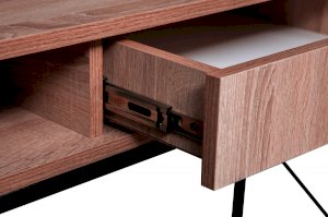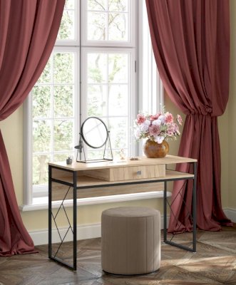 Опоры и декоративные элементы сделаны из металла. Столешница выполнена из ЛДСП. Геометрические элементы по бокам придают строгому письменному столу стиль и красоту. Плюс к этому они еще и функциональны – через них легко можно пропустить любой провод, что невозможно при сплошных боковых панелях. Металлическая основа имеет специальное укрепление, которое позволяет выдержать нагрузку до 80 кг. Таким образом, стол без труда выдержит всю технику, необходимую для учебы и для работы. Габариты столешницы позволяют разместить на своей площади большой монитор, принтер и оставить место для работы с бумагами и учебниками. Выдвижной ящик снабжен шариковыми направляющими, что обеспечивает плавное и бесшумное выдвижение. Справа и слева от выдвижного ящика есть две удобные ниши, в которые можно убрать то, что не предназначено для всеобщего обозрения.