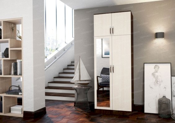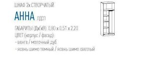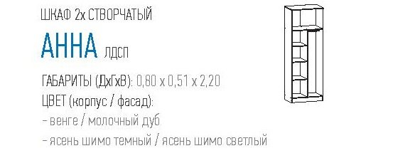 внутреннее наполнение                  Распашной шкаф «Анна» отлично смотрится в современных интерьерах. Двустворчатая модель выглядит компактной и не загромождает собой пространство. Она отличается простым, но далеко не безликим дизайном. Искусная комбинация отделки контрастных цветов, темные ручки на фоне светлых дверей, а также ассиметричное расположение зеркала делают эту вещь интересной и запоминающейся.