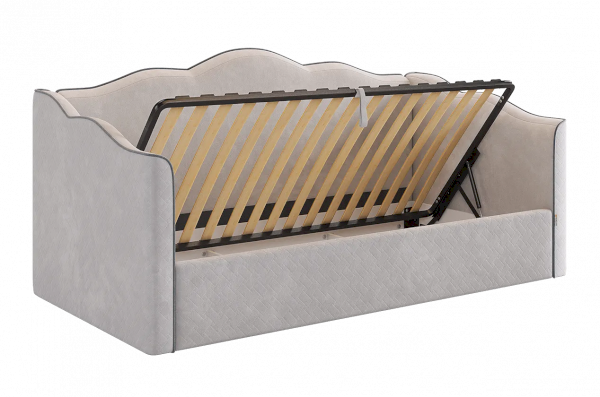 Кровать оснащена надежным подъемным механизмом, обеспечивающим доступ к вместительному ящику для хранения постельного белья и других вещей. Декоративные подушки с кисточками добавляют изысканности (входят в комплект), а специальный чехол для матраца обеспечивает дополнительную гигиеничность и удобство использования (комплектуется отдельно).