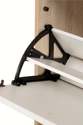 Данная модель обувницы удобна и функциональна в использовании. Конструкцией предусмотрено две закрытых ниши, за откидными дверками которых имеется удобные полочки для обуви.