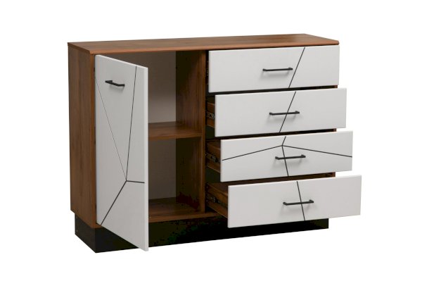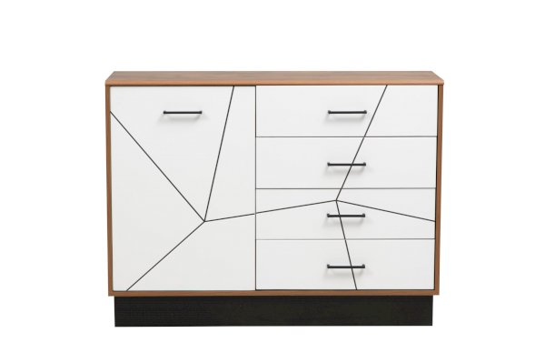 Данный модуль разделен на две части, у каждой из которых свой функционал. Справа расположены четыре выдвижных ящика – один под другим. Слева – за распашной дверцей – полки. Целых четыре ящика позволяют разместить абсолютно разные сегменты вещей. Это могут быть и документы, и сложенные вещи, и постельные принадлежности, а нижний ящик подойдет для обуви. Если поставить комод в прихожей и сверху повесить полку 54.09, получится отличная прихожая – по ширине эти два модуля совпадают и визуально будут смотреться комплектом. Ящики снабжены шариковыми направляющими, которые обеспечивают плавный ход выдвижения.