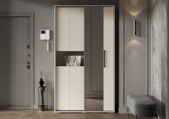 Разделение на секции: Одна часть прихожей включает две одинаковые секции с полками, закрытые створками. В каждой секции предусмотрено по две съёмные полки, что позволяет настраивать пространство под ваши нужды. Открывание створок осуществляется за выступ, что делает использование шкафа более удобным.
