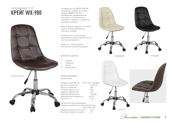 Полубарный стул КРЕЙГ WX-980 разработан с применением крестовины на пяти колесах, газлифта и поворотно-подъемного механизма качания. Мягкие формы сидения и стеганой спинки оптимальной высоты обеспечат комфорт. Сиденье и спинка обтянуты искусственной кожей. Нижняя часть стула (газлифт, крестовина и колеса) выполнены из прочных материалов.