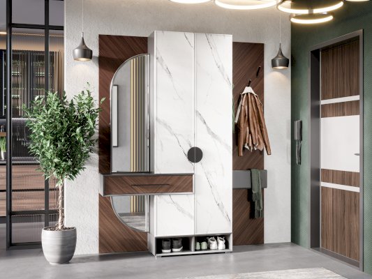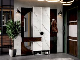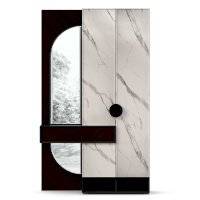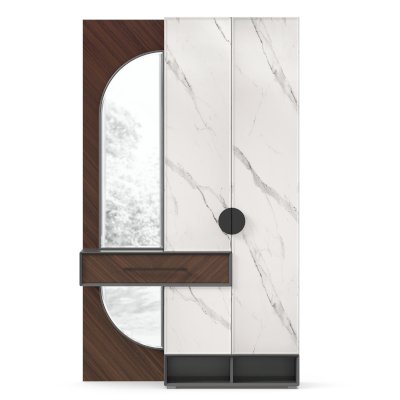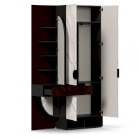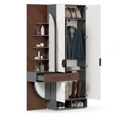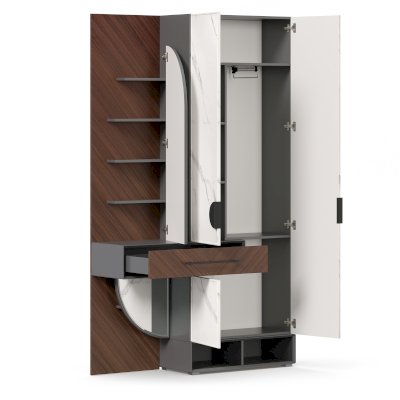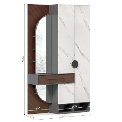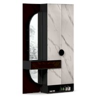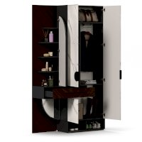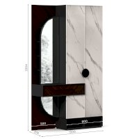 - Слева от шкафа вертикальный шит, вверху 4 полки за распашной дверью с зеркалом, внизу под ящиком полка за декоративной панелью с зеркалом